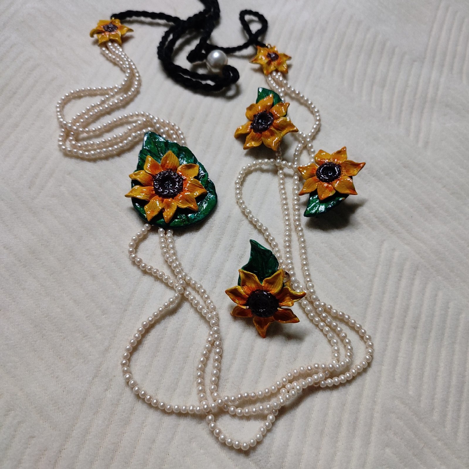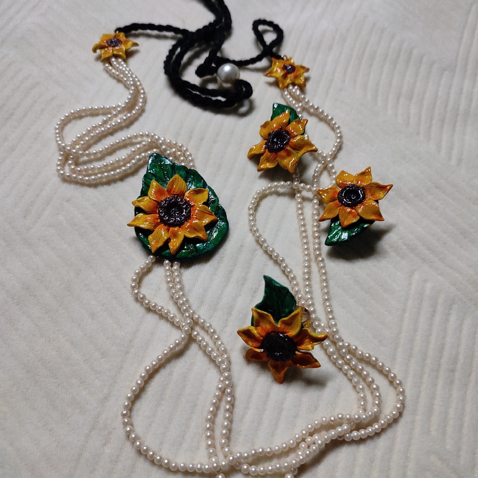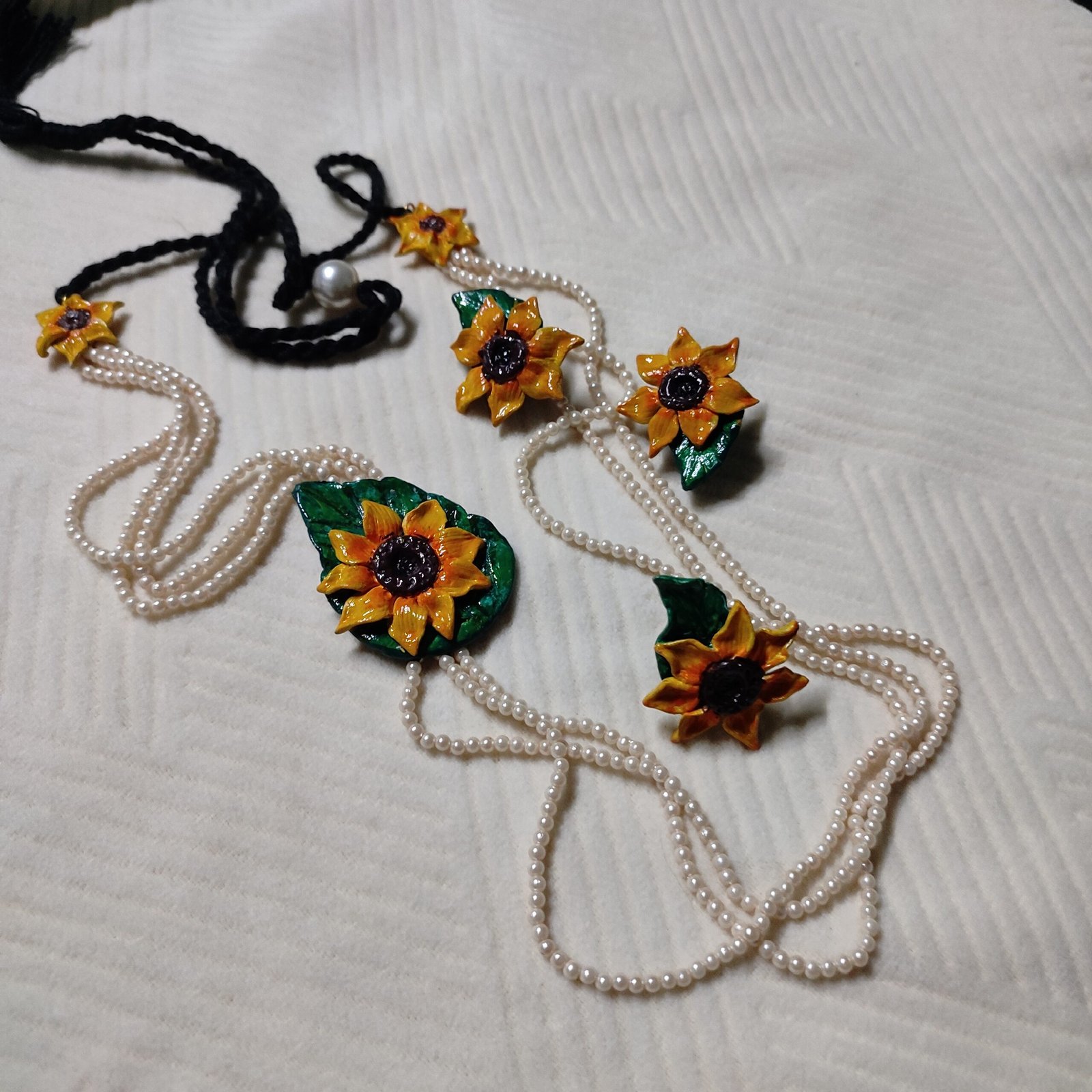 Sunflower on leaf necklace set containing 1 necklace and 2 ear rings.